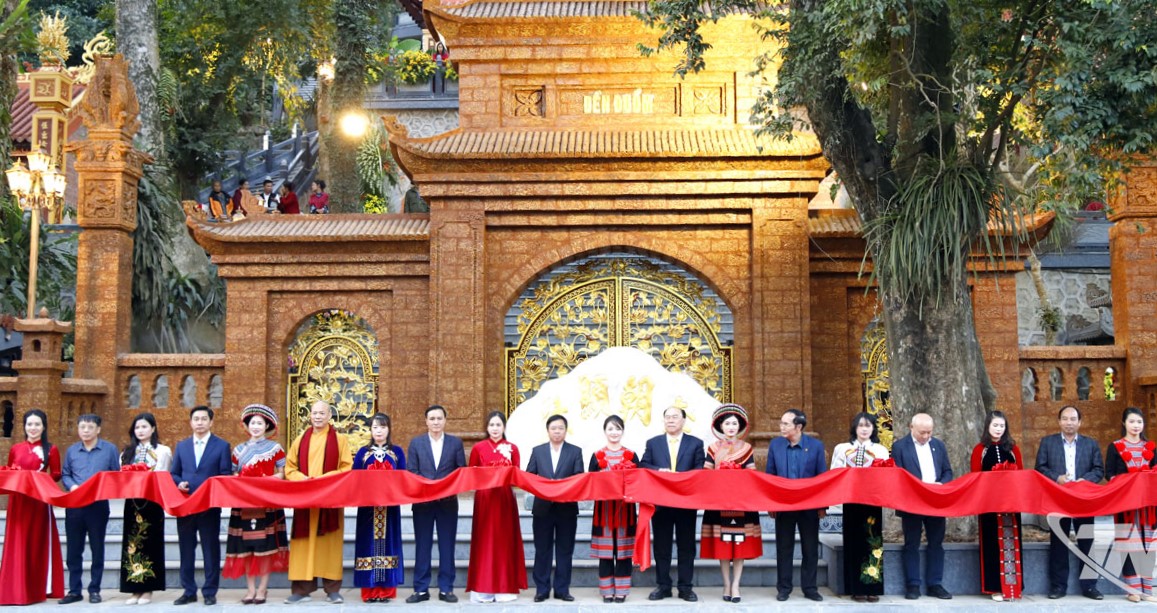 Các đại biểu cắt băng lễ khánh thành công trình tu bổ, tôn tạo Di tích lịch sử quốc gia đền Đuổm